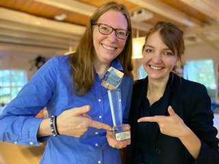 Güde und Nina betreten in ihren langen festlichen Abendkleidern die Bühne, die Scheinwerfer sind auf die beiden gerichtet und lassen den gläsernen Pokal und die Gesichter erstrahlen. Die Augen der beiden sind den Tränen vor Rührung über diese Auszeichnung nah.